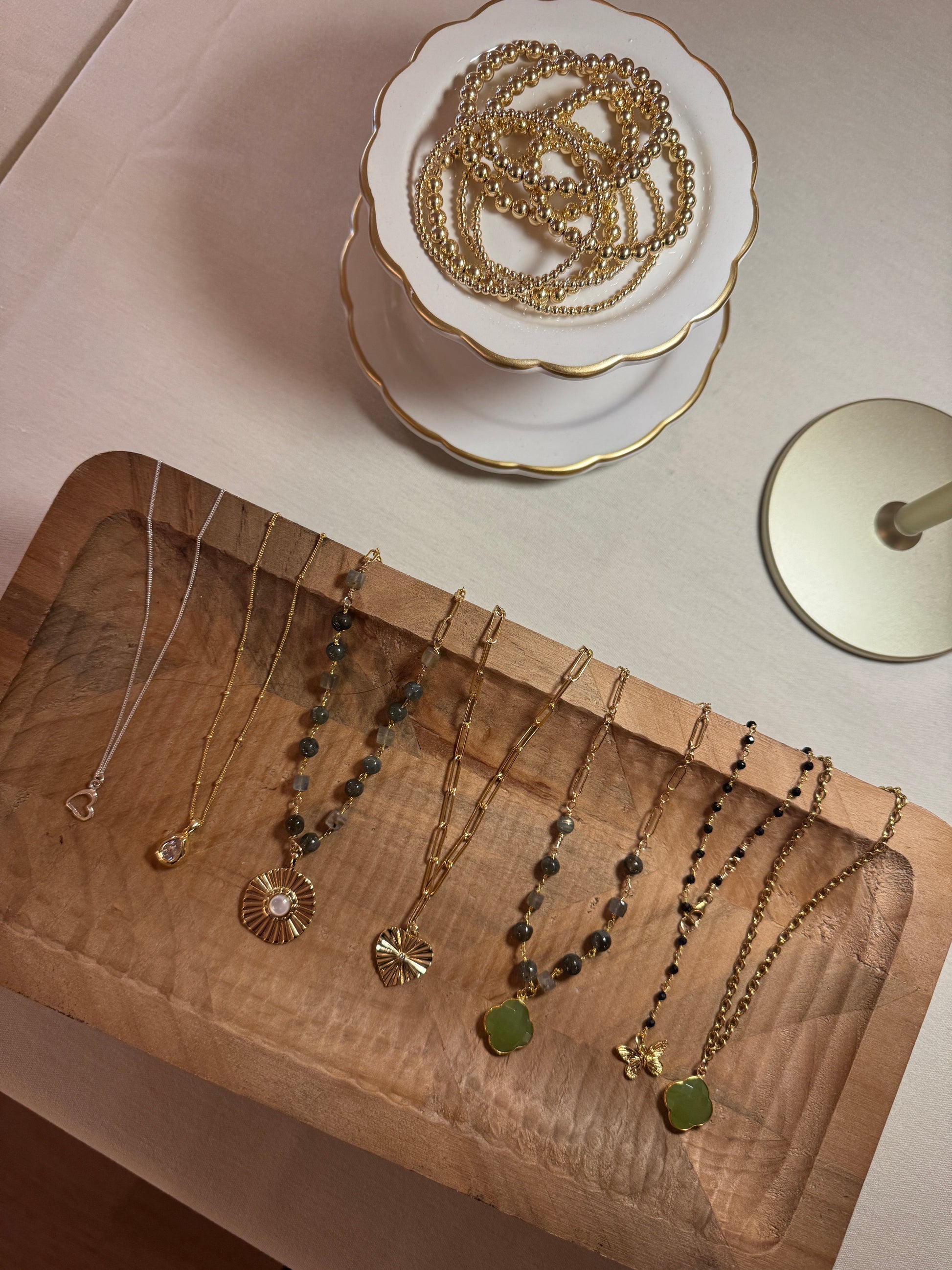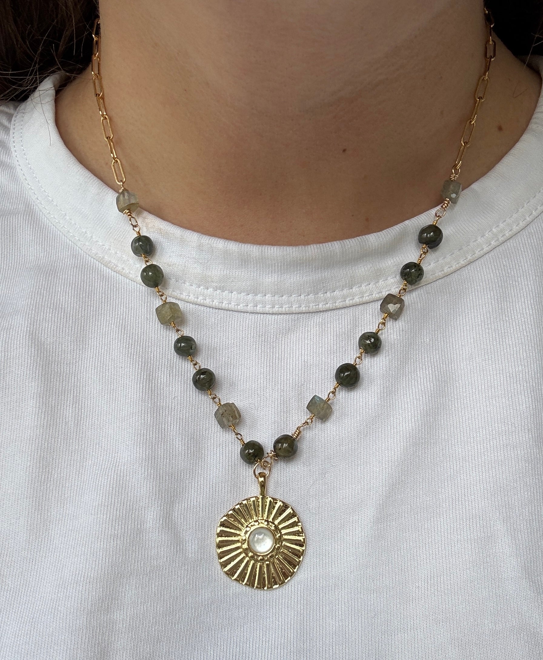 Green Beaded Rosary & Paperclip Chain Sun Necklace